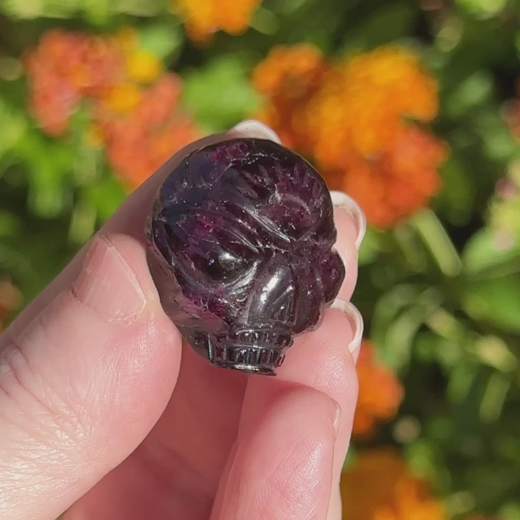 This is an adorable gemstone mini Starbeing Crystal Palm Skull carved by Leandro de Souza in Brazil. Beautiful Garnet.