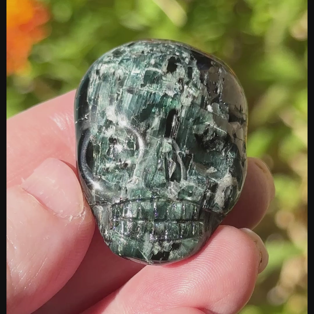 This is an beautiful quality gemstone palm skull carved from Green Tourmaline by Leandro de Souza in Brazil.